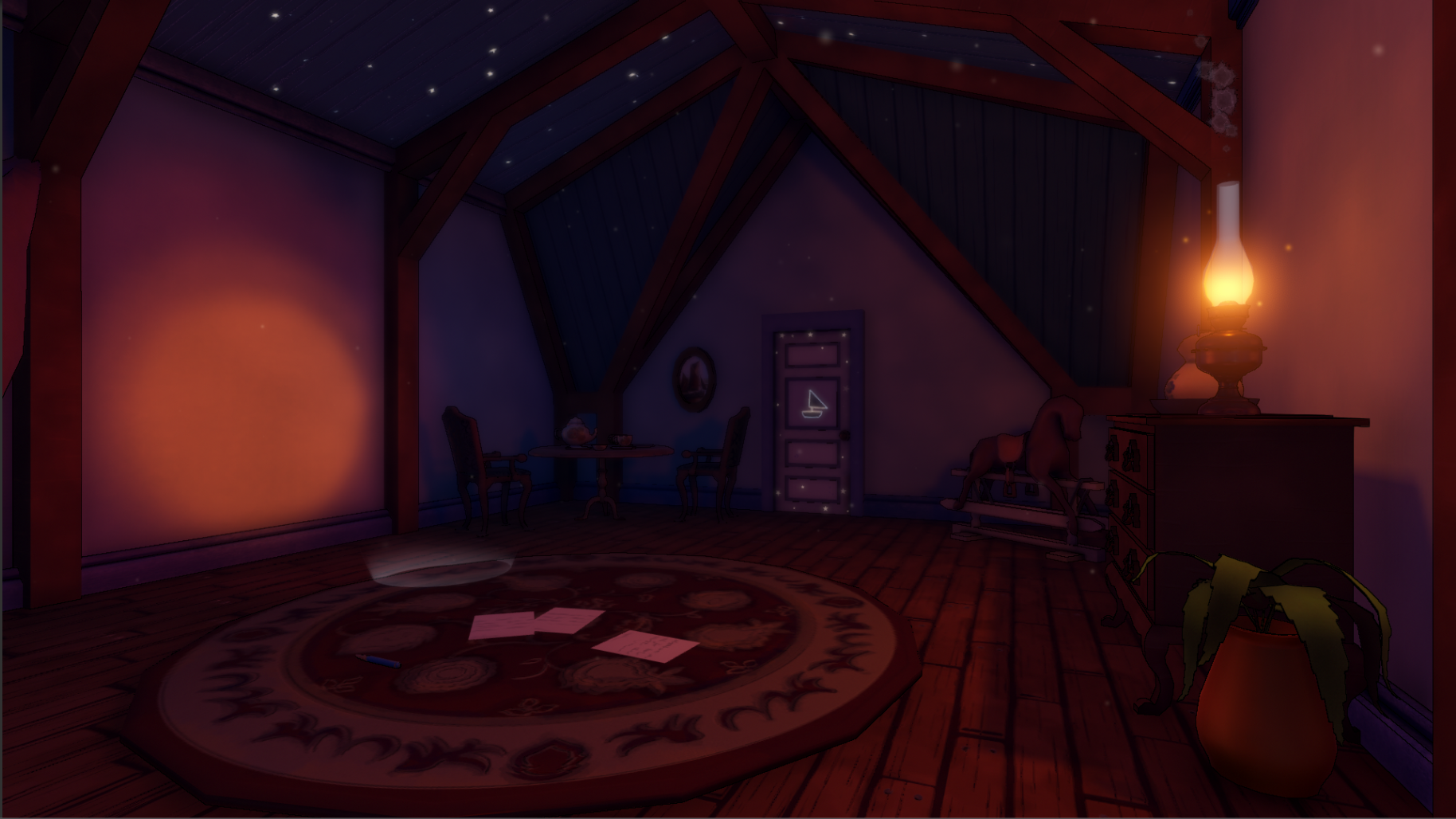 To create the lighting for Aluna we (the artists on the team) gave each room it’s own color palette which was used to help guide the creation of textures and materials. Then when I went to create the lighting I would both adjust the colors of the textures to make sure that they where all still working once placed next to each other and then I used colored lights to exaggerate the colors of each room in different ways to create a very surreal and fantastical look to the games world.