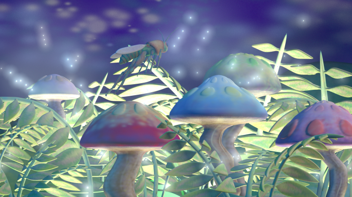 Anyway the project was to create a kind of fantastical and whimsical environment that was in the style of macrophotography, and had a bug move through the scene. I chose to do a grasshopper, unfortunately though there was a problem with the particle effects so they cut to different positions a few times, I’ll probably re-render it at some point to fix that. All of the textures where painted in photoshop by myself and everything was modeled in maya.