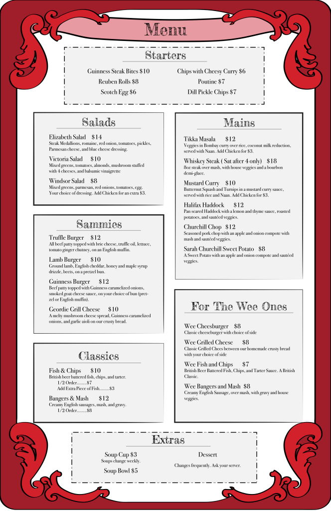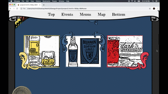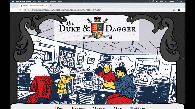 On of my assignments for a web design course was to redo the website of a local restaurant of our choice and to make the websites branding match the kind of restaurant that the place was. So I decided to redo the website for a place called the Duke and Dagger, which is a British pub in Menomonie, WI. The restaurant itself already had this logo that was reminiscent of the woodcut printing style that was popular in Europe during the 15th century. So going off of that I tried to design the rest of the website to have a similar look to it, using thicker strokes to invoke that style. I also carried over the colors from the logo into my design for the rest of the website so that it would feel cohesive with the restaurants brand.