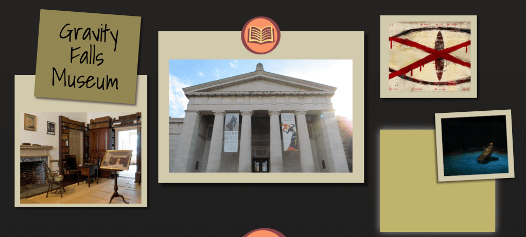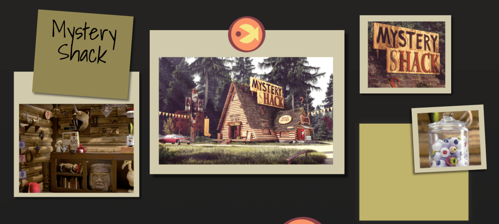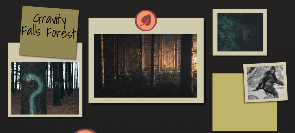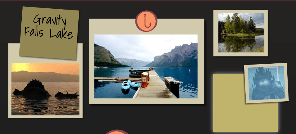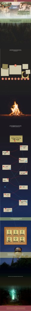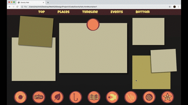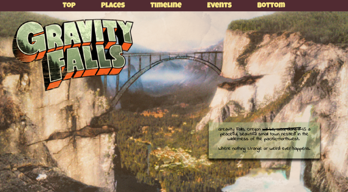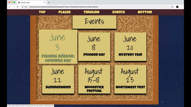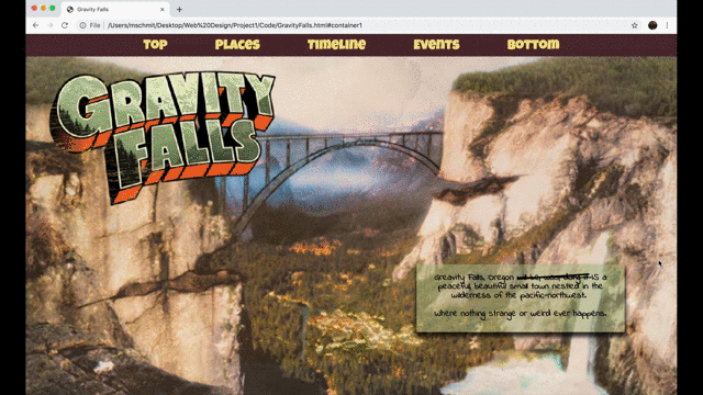 For a web design course I was assigned to create a travel micro-site for a fictional place. I decided to make one for the fictional town of Gravity Falls, Oregon from the Disney cartoon of the same name. For the project I created a wireframe layout and then three possible visual layouts. Below are some gifs and photos of the intractable elements from the final website design. There’s also a visual layout that is close to what the final website would look like, with the exception of some font changes and some small tweeks.